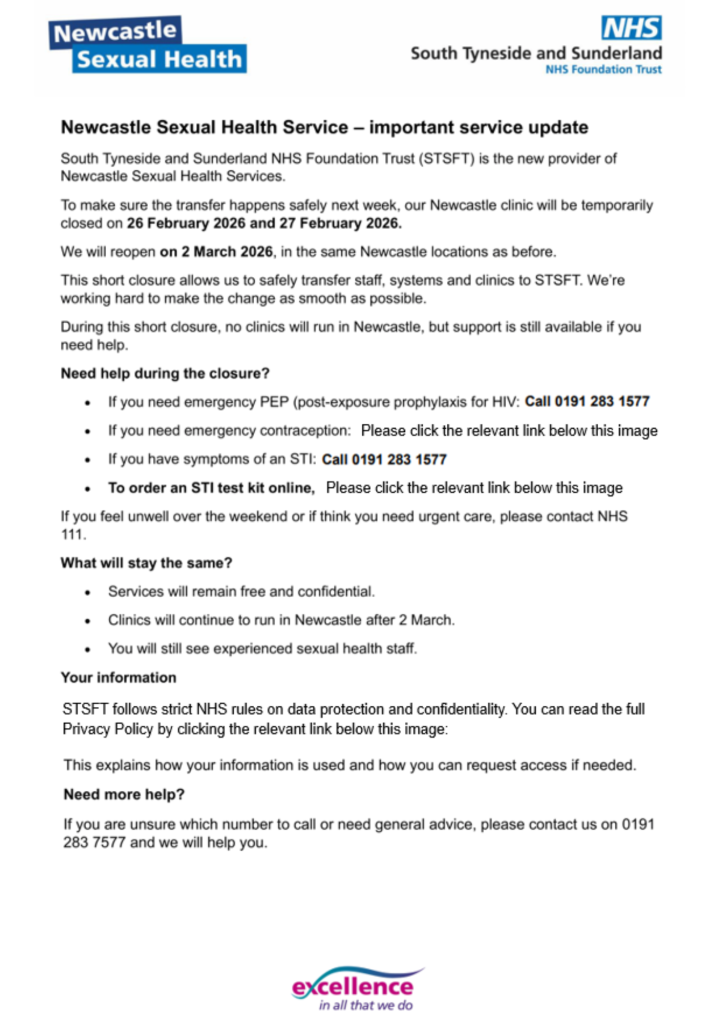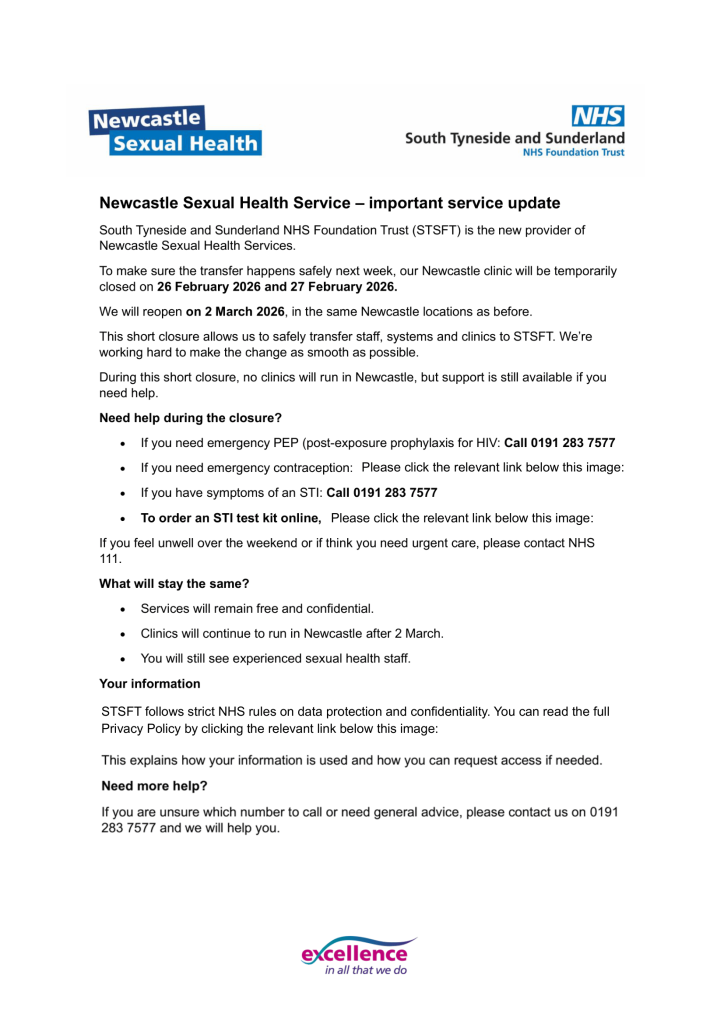 We’re here to help adults and young people in Newcastle with all their sexual health and contraception needs. Our service offers advice, information, testing, and treatment for sexual health issues, whilst also providing an online option for testing and treatment, and hormonal contraception to make it more convenient for you!
